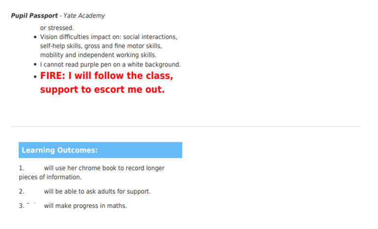 Students with an EHCP have three targets on their student passport linked to the outcomes on their EHCP which is shared with all teaching staff.